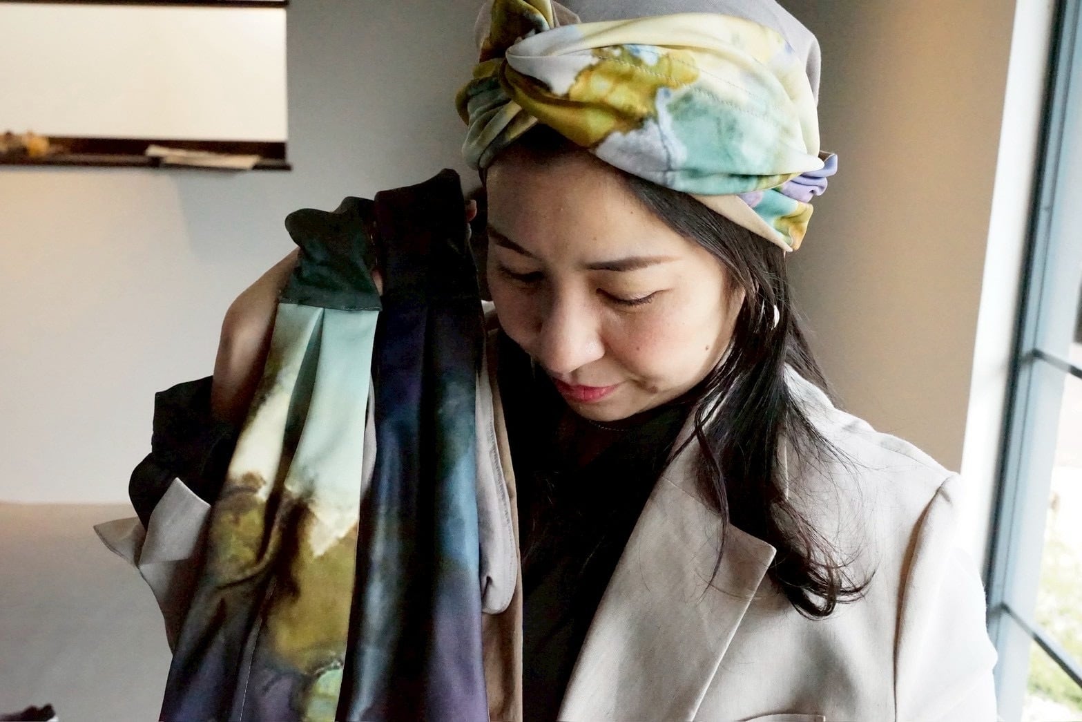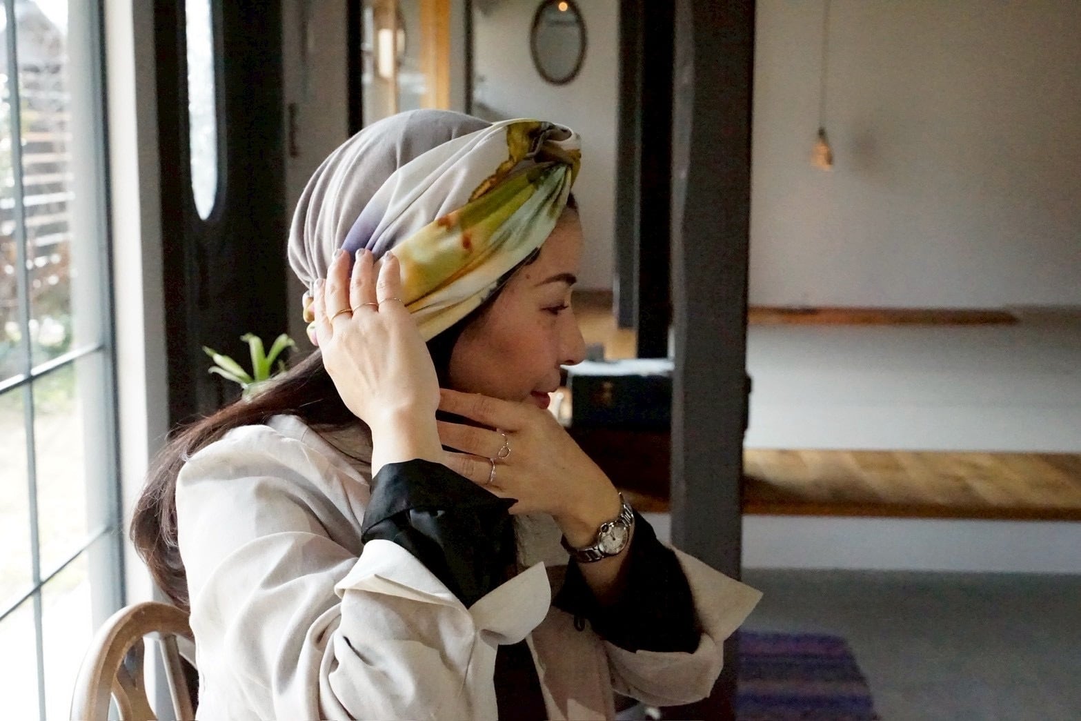 ターバンとして髪をまとめたり、帽子として頭全体をカバーしたり、2wayで楽しめるヘアアクセサリーアイテム